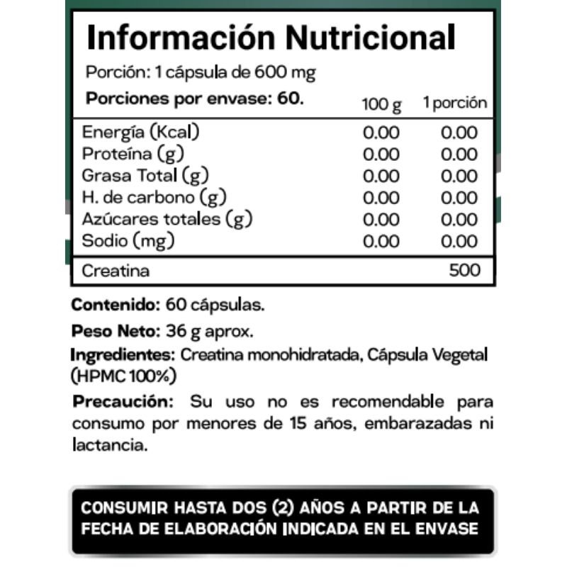 La creatina monohidratada en cápsula vegetal es ideal para deportistas que buscan mejorar fuerza, masa muscular y recuperación. Aumenta la energía disponible en esfuerzos de alta intensidad y corta duración. Presentación práctica en cápsulas vegetales.