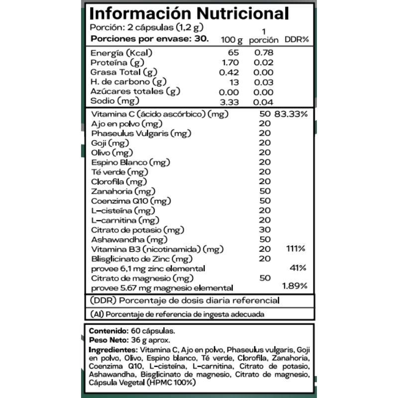 Aporta vitaminas y minerales para energía, defensas, huesos y cognición. Fórmula integral para envejecimiento saludable.