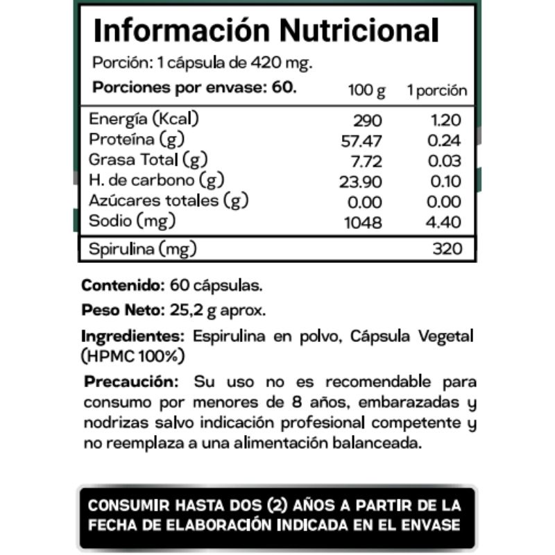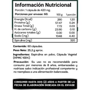 La spirulina es una microalga con alto contenido de proteínas, clorofila, vitaminas del complejo B, hierro y antioxidantes. Aporta energía, mejora la oxigenación celular y fortalece el sistema inmune. También ayuda en procesos de detoxificación.