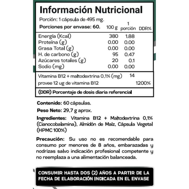 Contribuye a la formación de glóbulos rojos, metabolismo energético y salud neurológica. Previene anemia megaloblástica y mejora la vitalidad.